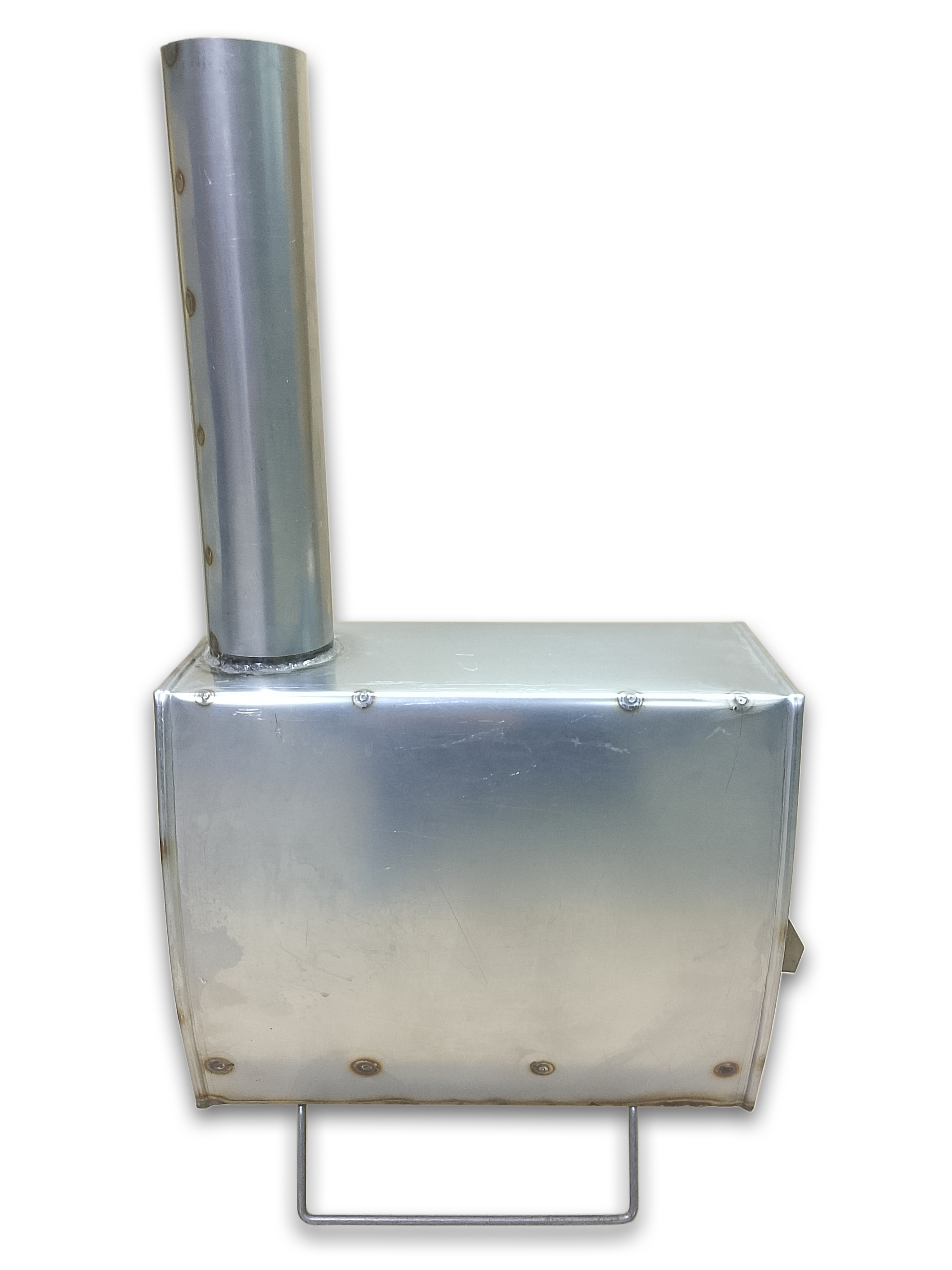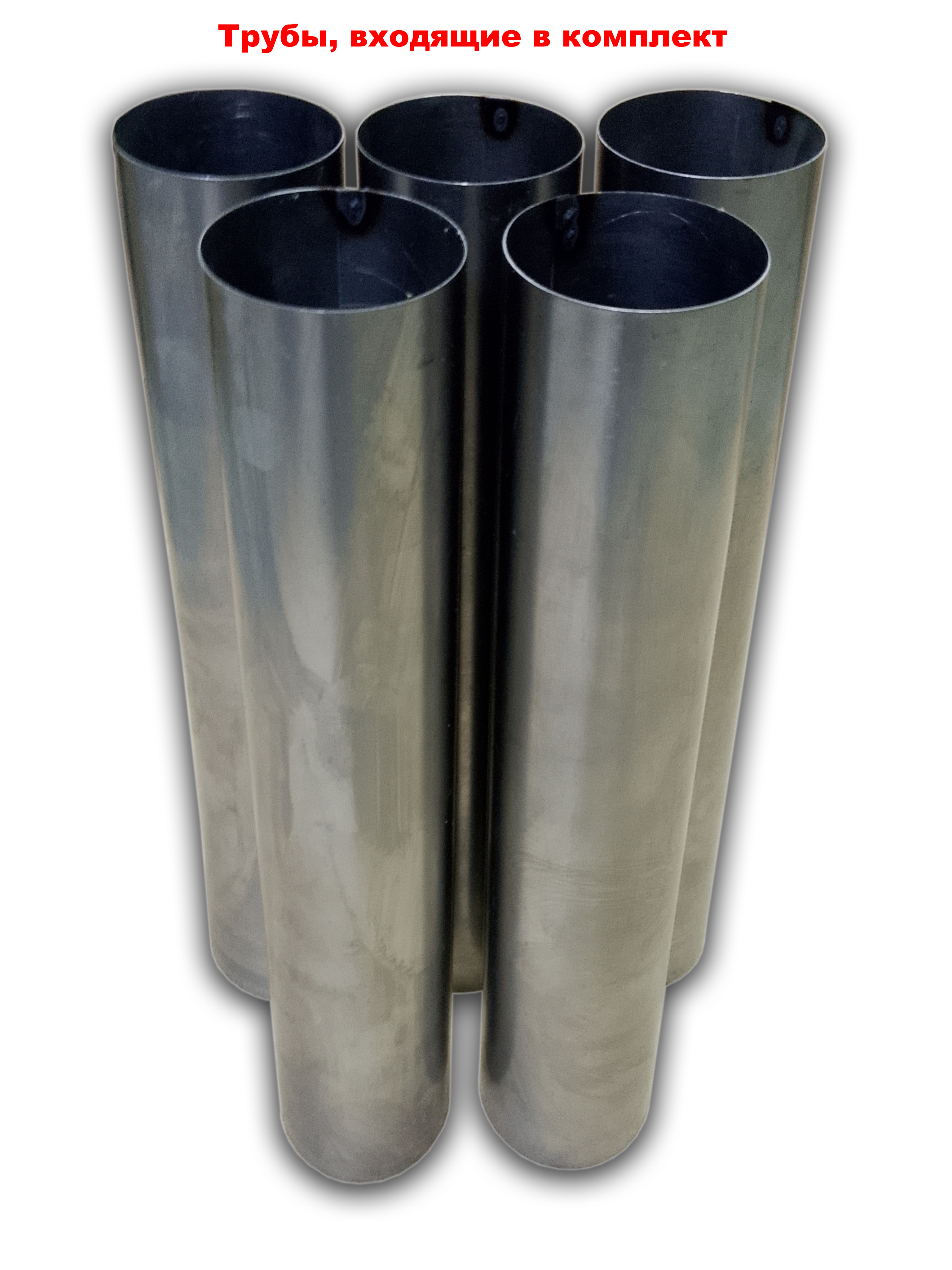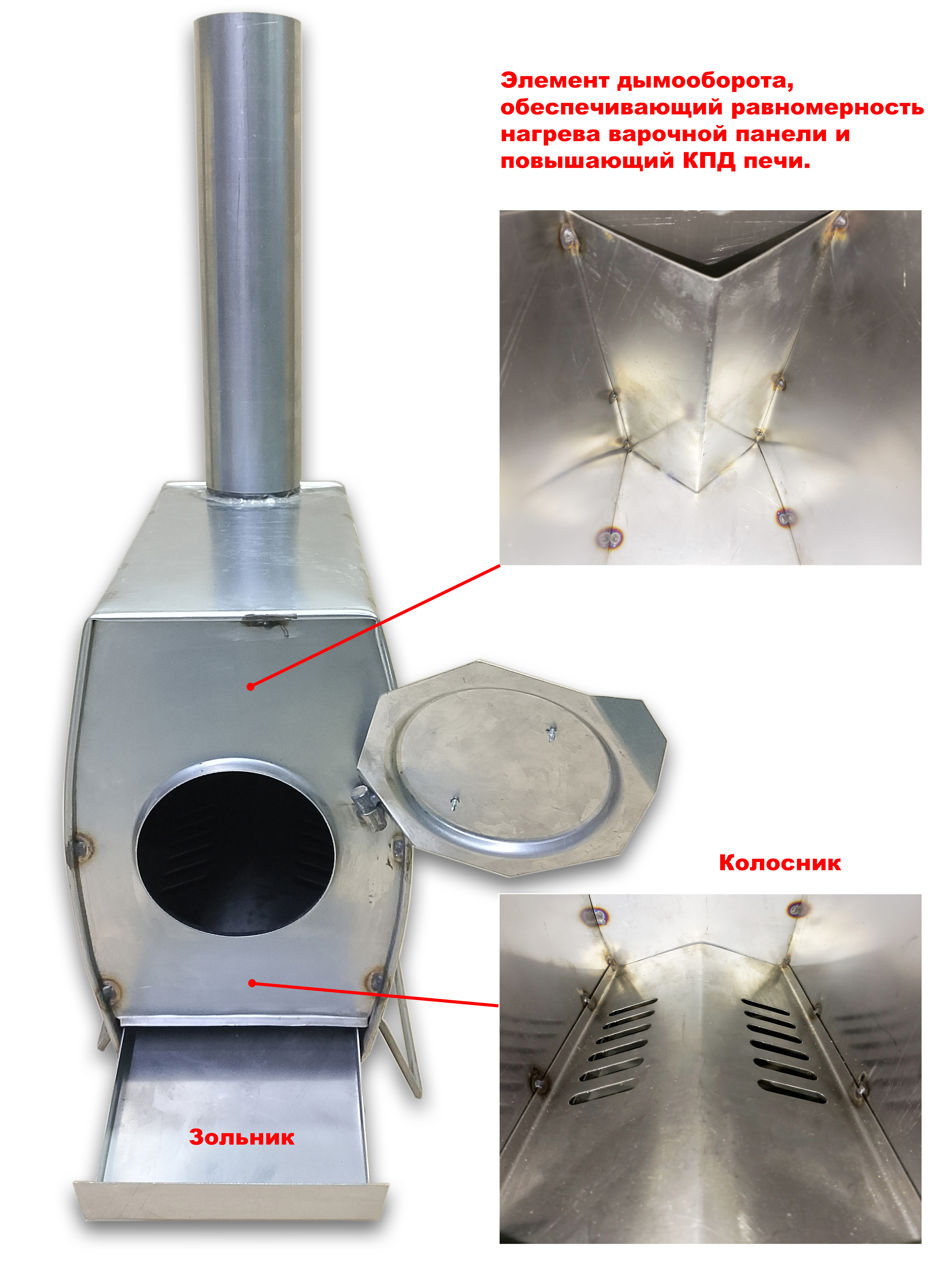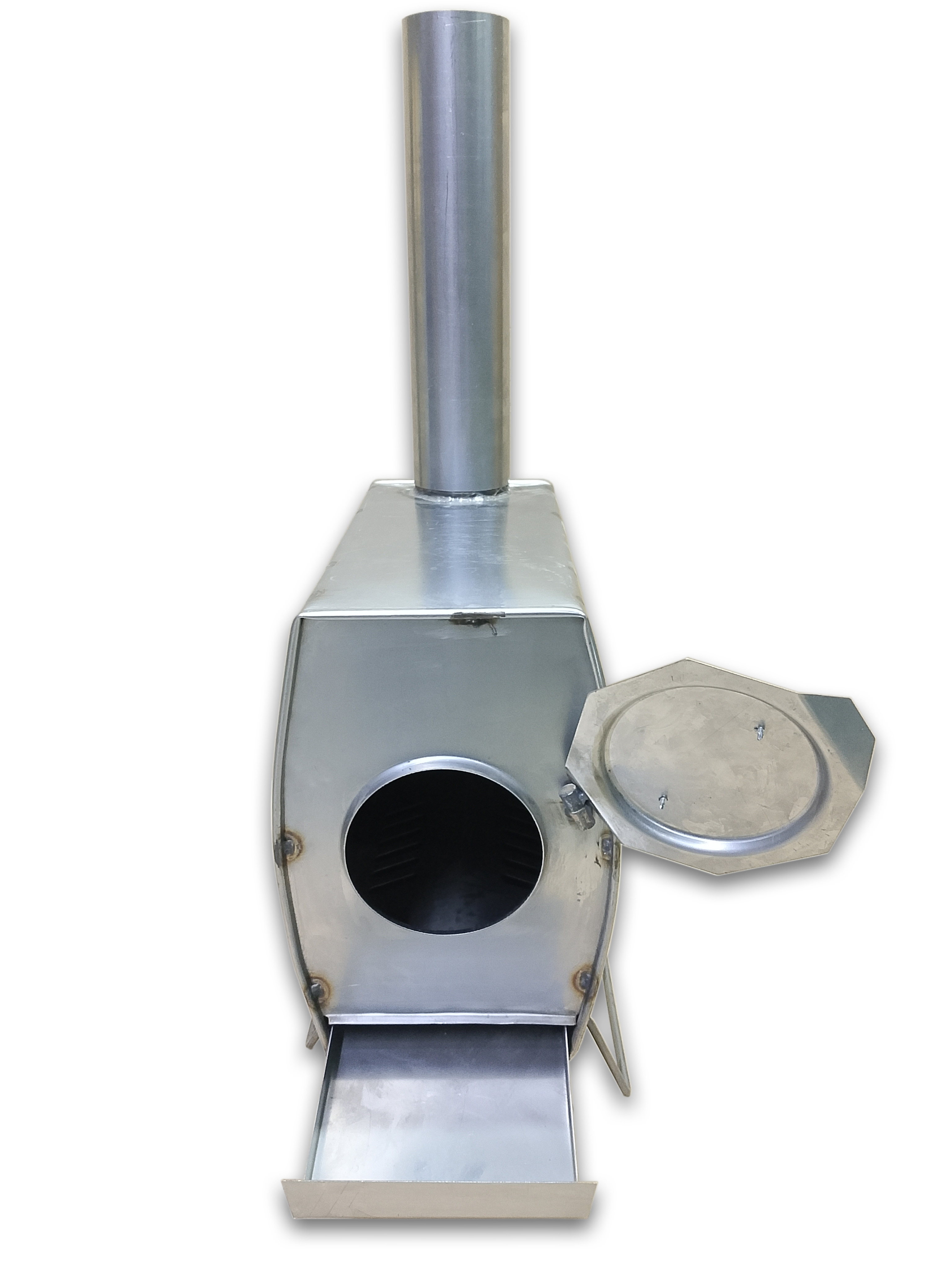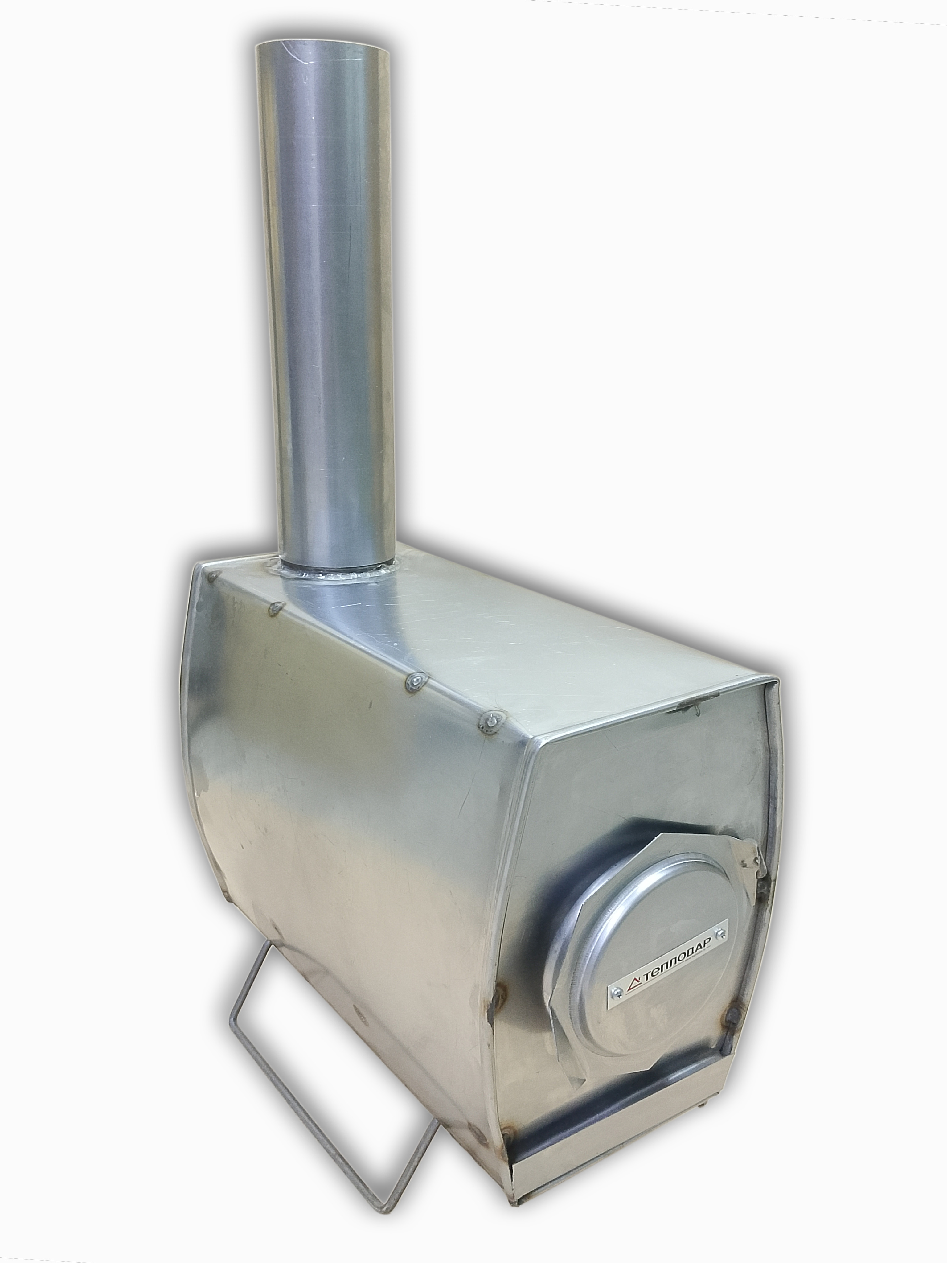 Печь из нержавеющей стали Теплодар Т-34 в комплекте с наборным дымоходом общей высотой 1.8м. Дымоход представлен трубами из нержавеющей стали. Печь Т-34 оборудована дверкой, выдвижным зольником и элементом внутреннего дымооборота.